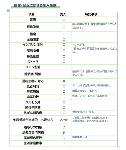 また、医療的な受入基準については、下記の表を参考にしてください。